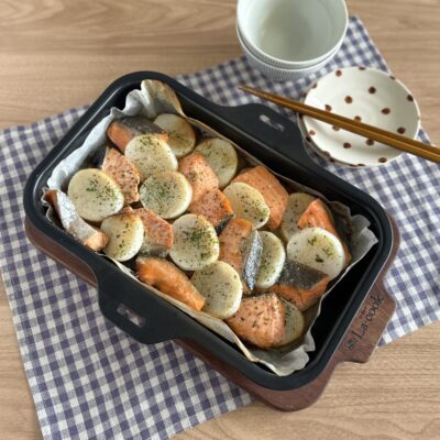 さんまの頭を落とし十字に切れ目を入れ、サラダ油を塗ったラ・クックに並べる。