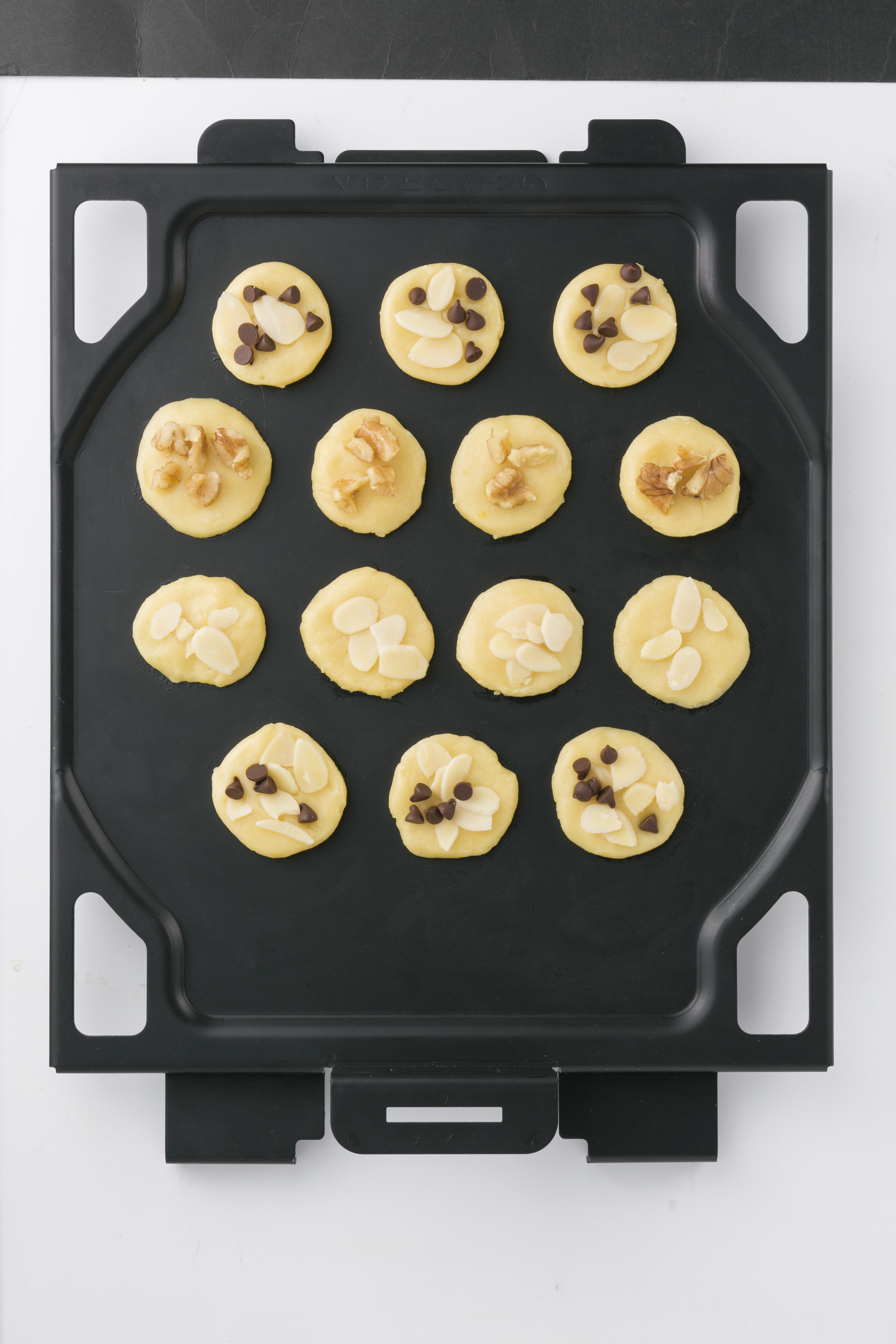 ※焼きあがり後は、すぐにクッキングプレートから取り出してください。クッキングプレートの余熱で裏面の焼き色が強くなります。お好みによりチョコレートチップ・アーモンドスライス・くるみなどを加えてください。