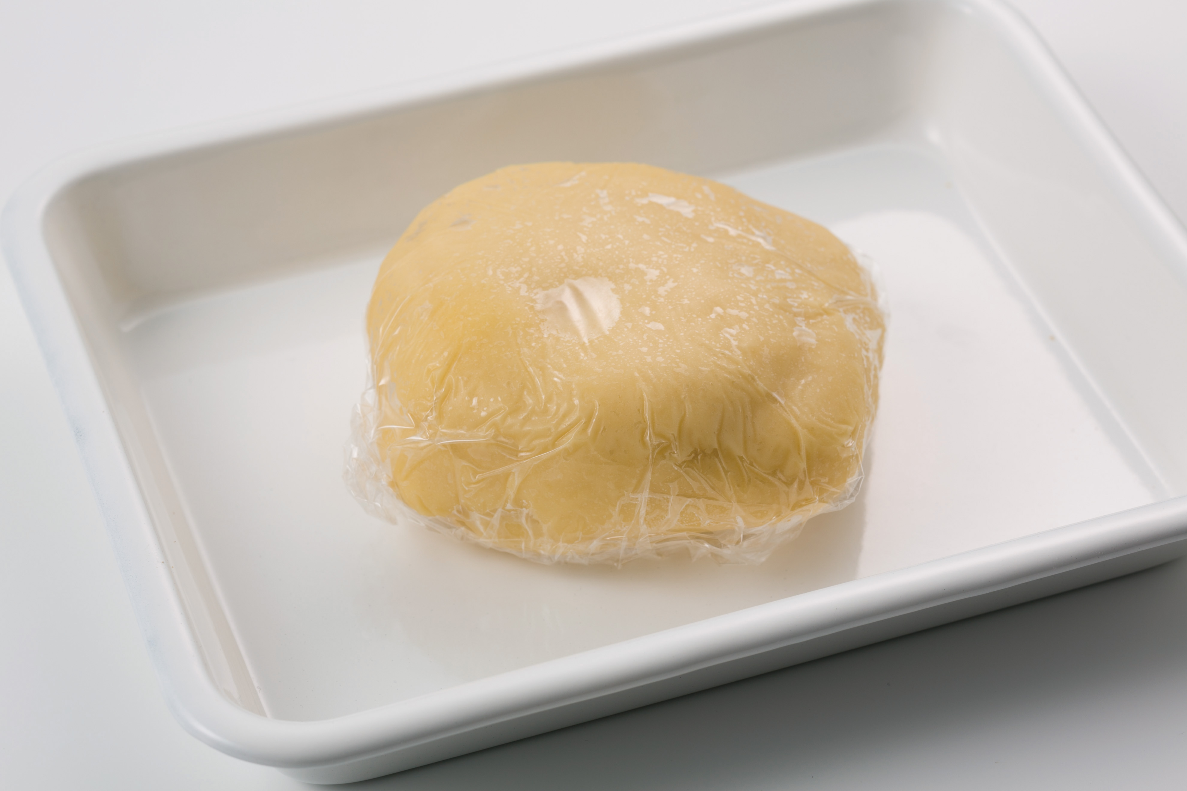 生地をまとめてラップに包み、冷蔵庫で30分ほどねかせます。