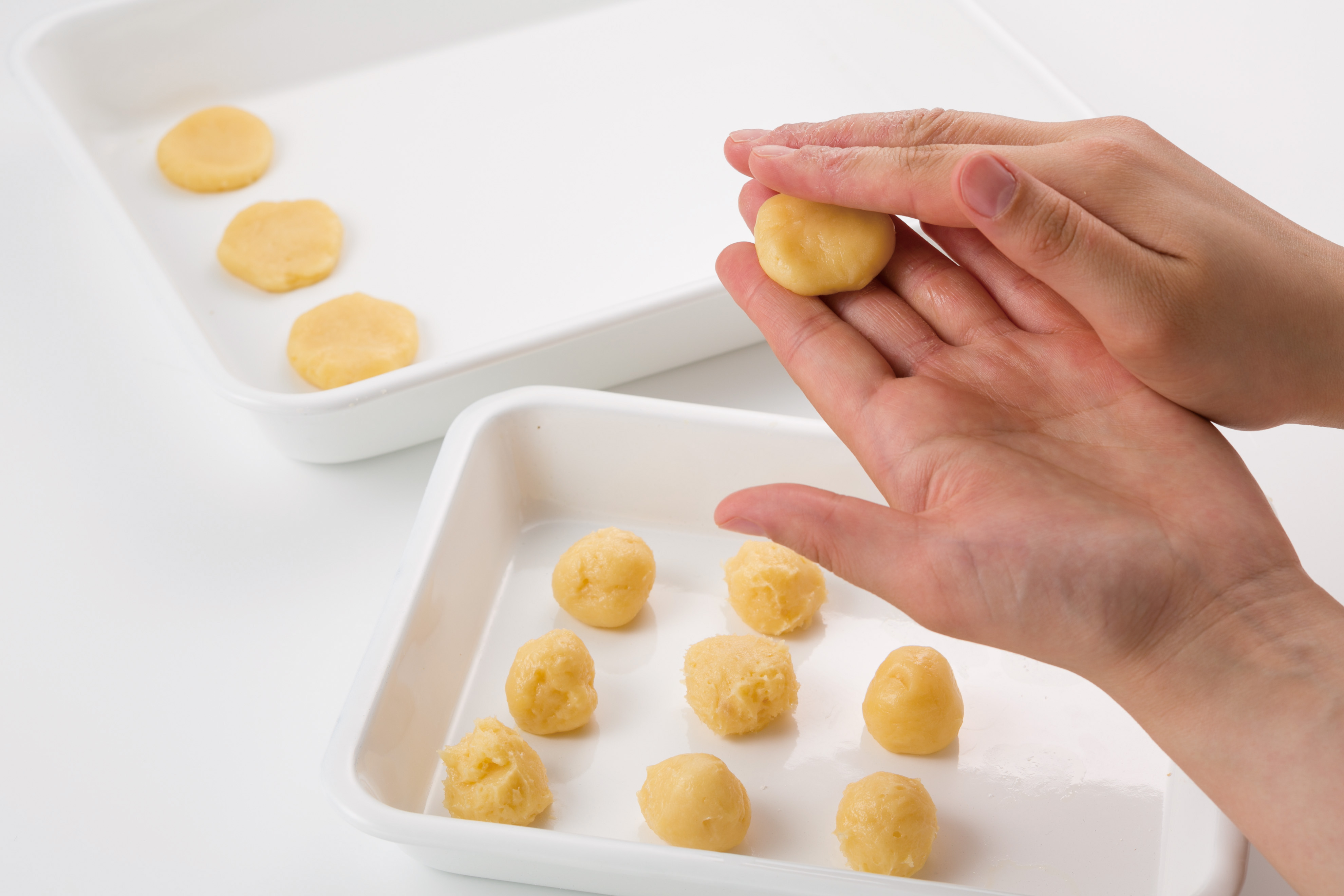 生地を約8gに丸め、手で形を平ら(厚さ25mm程度)に整えクッキングプレートに並べます。