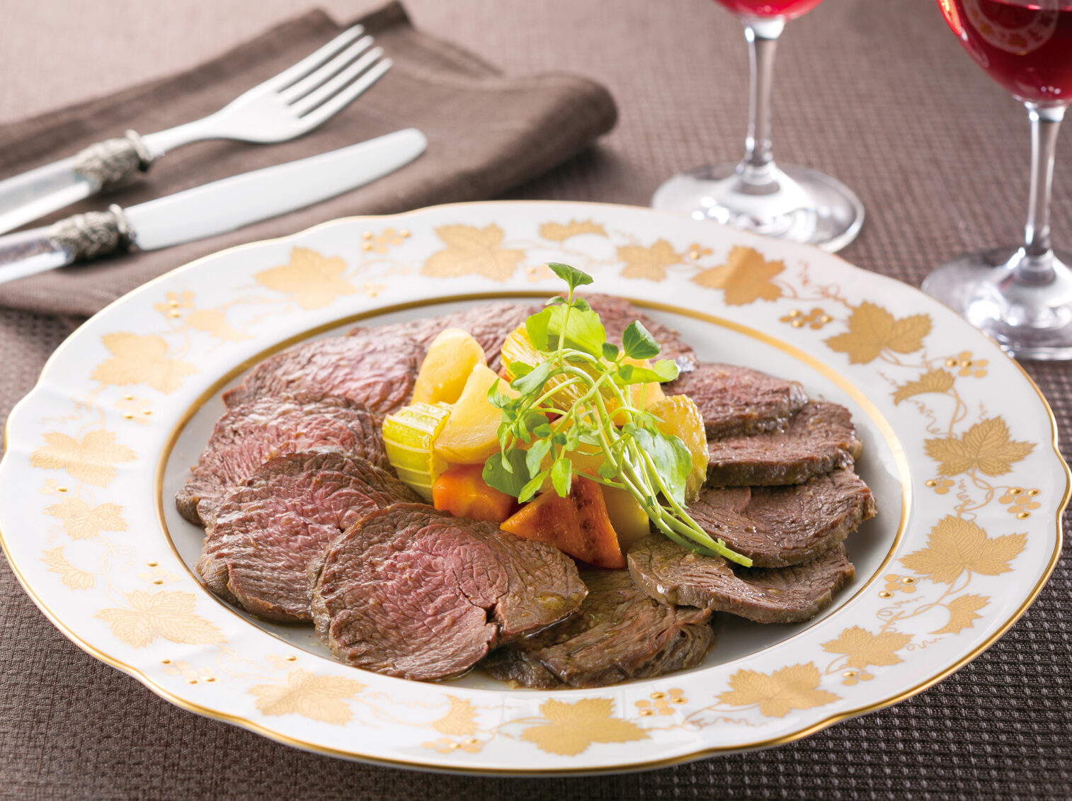 ④の牛肉を取り出してアルミ箔に包み、しばらくおき、食べやすい厚さにスライスする。
