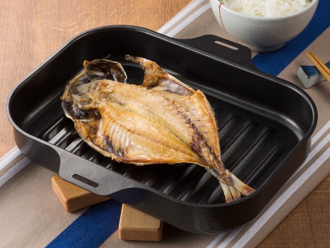 ラ・クックにサラダ油を塗ってあじを入れ、フタをしてグリルの強火で8分焼きます。