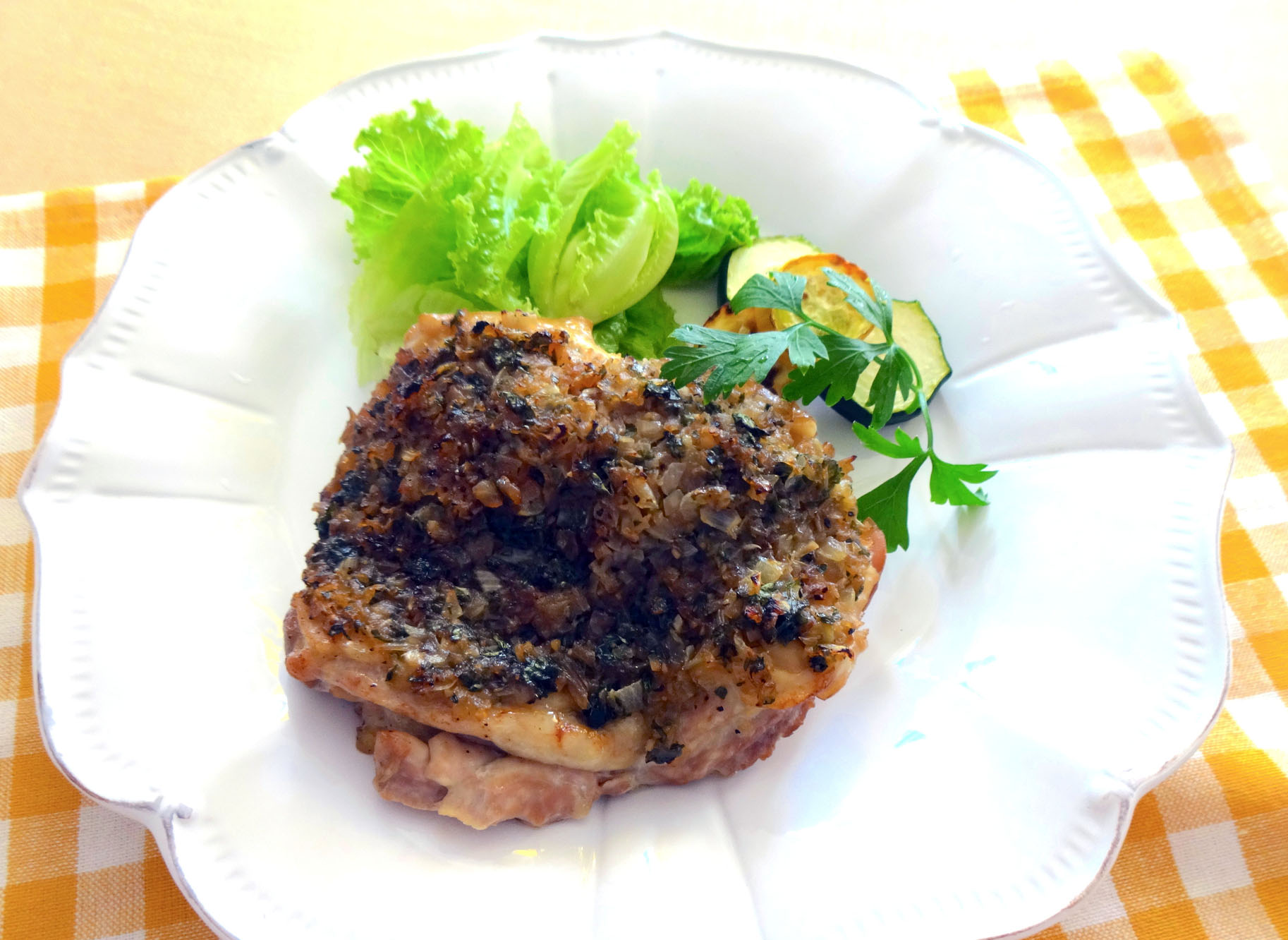 鶏もも肉は厚さが均等になるように切れ目を入れて開き、塩•こしょうを振り下味を付ける。