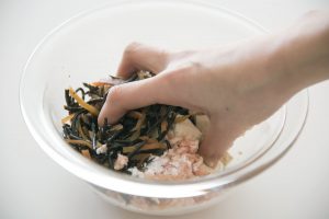 ボウルに①と鶏挽肉、ひじき煮物、Aを入れ、粘りが出るまでよく混ぜる。