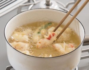 よく混ぜ合わせたAに①をくぐらせ、温度キープ機能で180度に合わせた油で2分ほど揚げる。