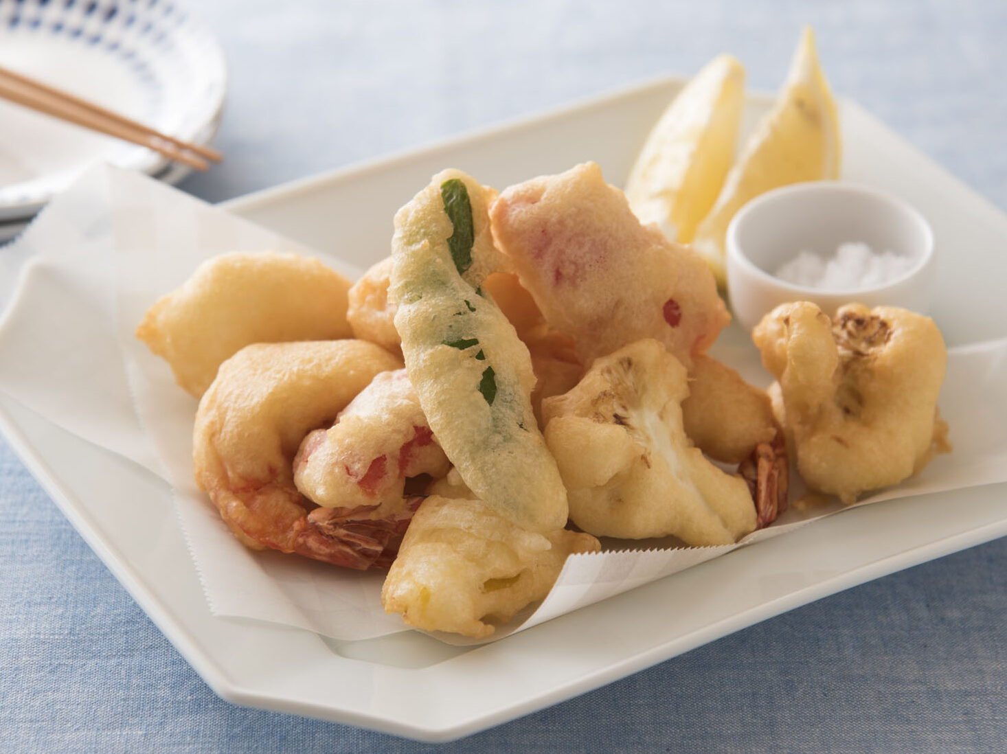 海老は殻と背ワタを取り、ホタテは横半分にスライスする。スナップエンドウはヘタと筋を取り、カリフラワーは小房に切り分け、パプリカは柄乱切りにする。