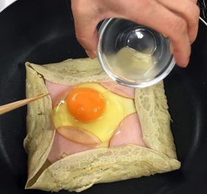 ③の真ん中にスライスチーズ•ハムをのせ、生地を折り込み、卵をのせる。
