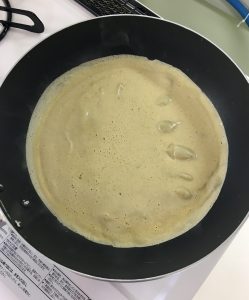 温度キープ機能を200℃に設定し(焦げる場合は温度を下げて下さい)、サラダ油を塗ったフライパンを温め、②の生地を流し込む。