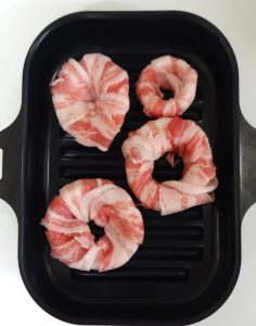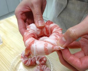 ①の玉ねぎに豚肉を巻き付け、塩•こしょうをふる。