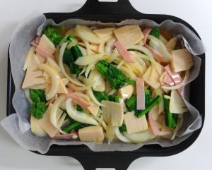 玉ねぎとたけのこは薄切りに、ハムは短冊切りにする。