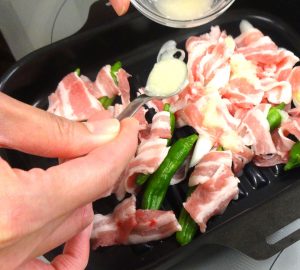 ①をラ・クックに並べ、合わせたAをかけ焼く。