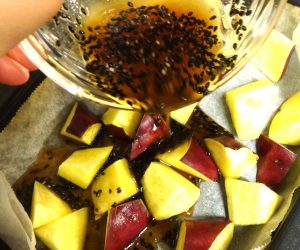 ①にごま油をまぶし、クッキングシートを敷いたラ•クックにのせて焼きます。