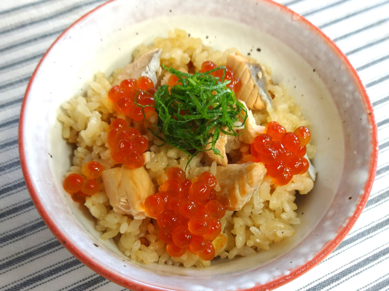 炊きあがったら鮭をほぐしながら混ぜ合わせ、器に盛りいくらと大葉を添えます。