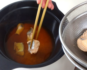 鍋にAを入れて煮立たせ、②を入れてさっと火を通しそのまま冷まし、鮭と煮汁と分けます。