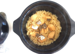 釜に①を入れ、③の煮汁を目盛まで入れて③の鮭をのせて炊き上げます。(煮汁が足りないときは水を加える)