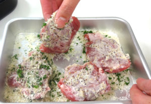豚ヒレ肉は食べやすい大きさに切って叩き、塩•こしょうをふって下味をつけます。