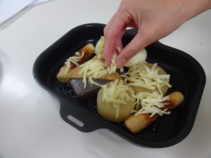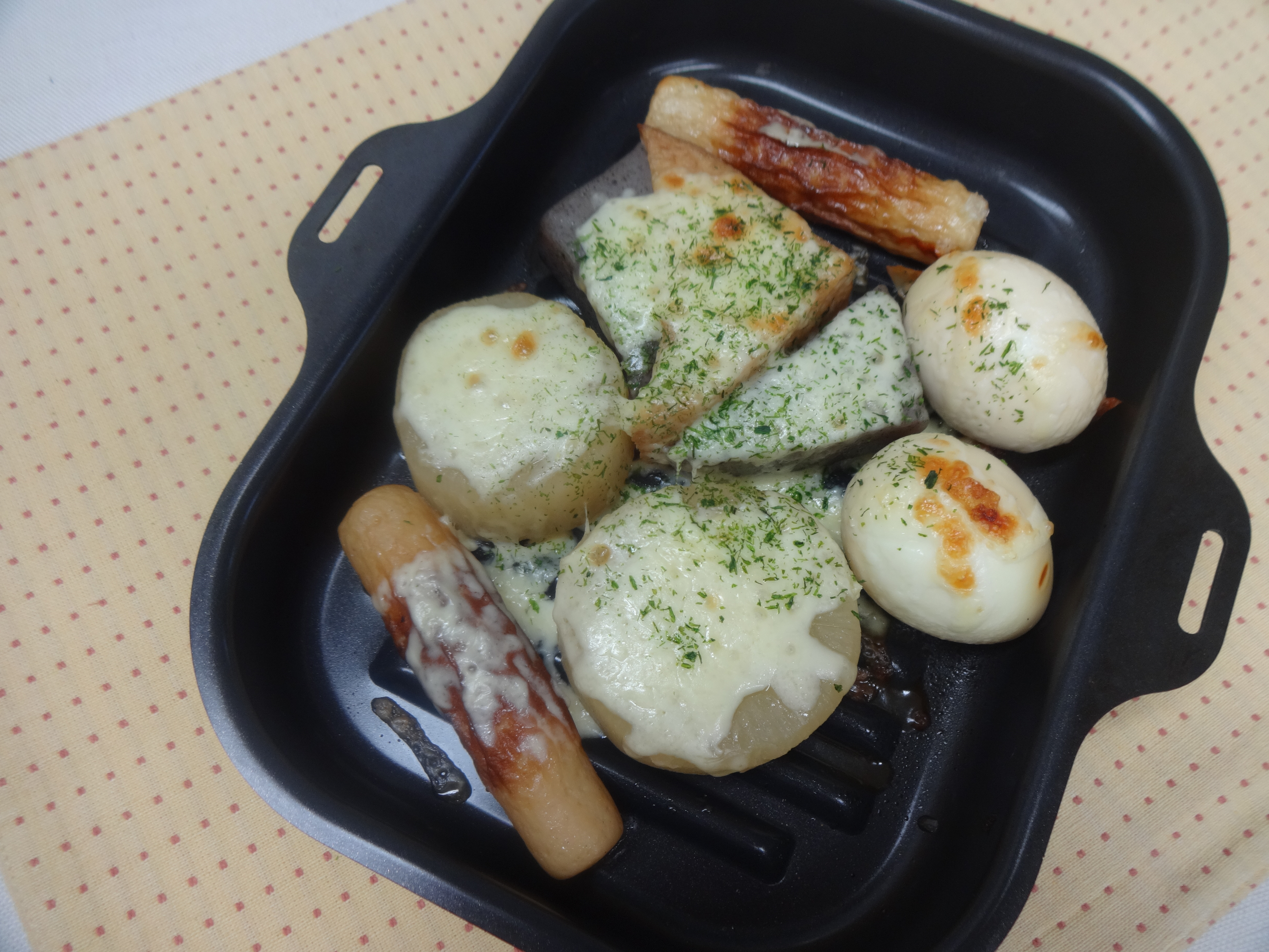 おでんの具をラ•クックにのせ、ピザ用チーズをかけて焼きます。
