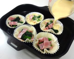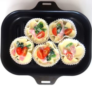 アルミカップに餃子の皮を敷き、ラ•クックに並べ①と合わせたAを流し込み、ミニトマトをのせます。
