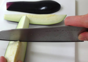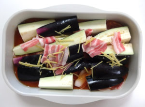 なすは縦に4等分に切り、さらに半分に切り、豚バラ肉は一口大に切ります。