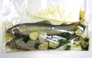 鮎はぬめりを取り、腹に切り込みを入れてワタを取り除き、きれいに水洗いします。