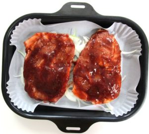 ラ•クックにクッキングシートを敷き、玉ねぎをのせてその上に②をのせて焼きます。
