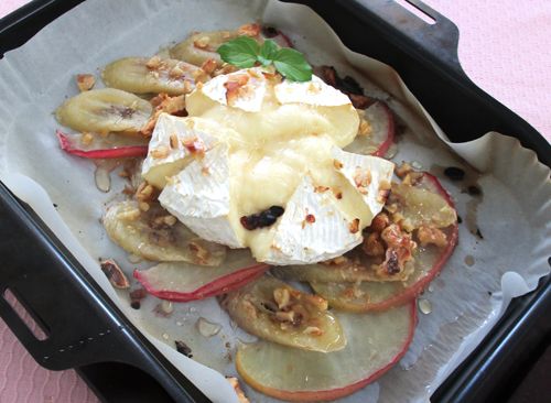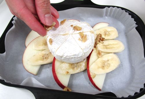 クッキングシートを敷いたラ•クックに①のりんごとバナナを交互に並べ、真ん中にカマンベールをのせ、 クルミを散らして焼きます。