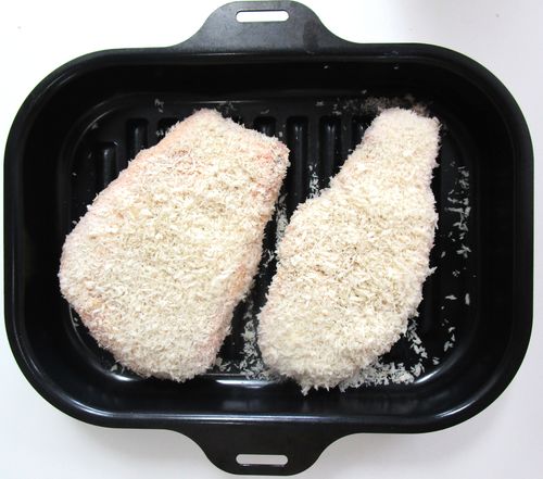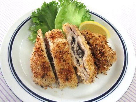 ②の表面に塩•こしょうをふり、小麦粉、溶き卵、パン粉の順に衣をつけます。