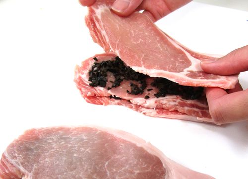 豚肉に①をのせえその上に豚肉をのせ、さらに①のオリーブをのせて最後にまた豚肉をのせます。 これを同様にもう1つ作ります。