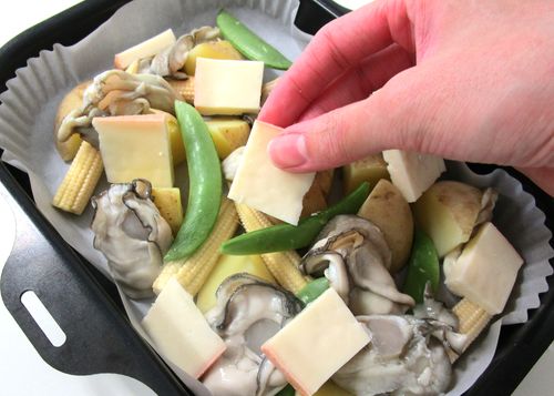 ラ•クックにクッキングシートを敷き、水気を拭き取った牡蠣と①ヤングコーン•ラクレットチーズをのせて焼きます。