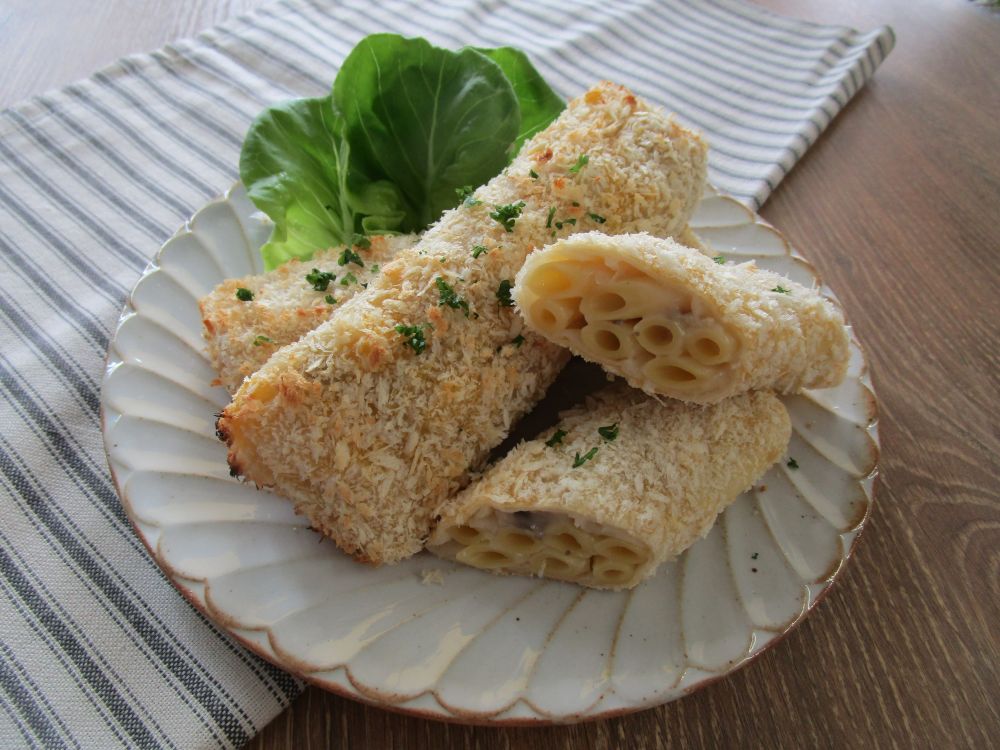 ②にマカロニ、ホワイトソースを入れて混ぜ、塩・こしょう、コンソメの素を加えて混ぜ合わせ粗熱をとります。