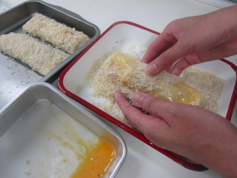 ③を春巻きの皮で巻き、小麦粉、溶き卵、パン粉の順に衣をつけます。