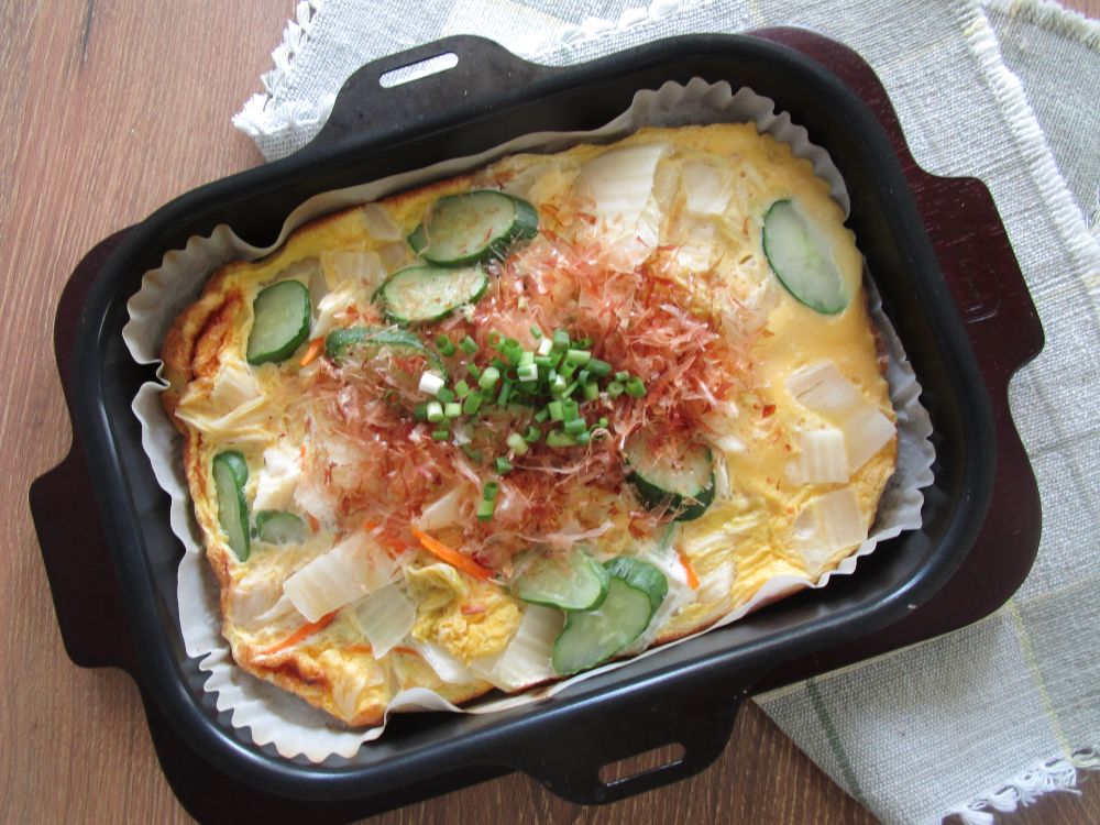 焼きあがったらかつお節と万能ネギを散らします。