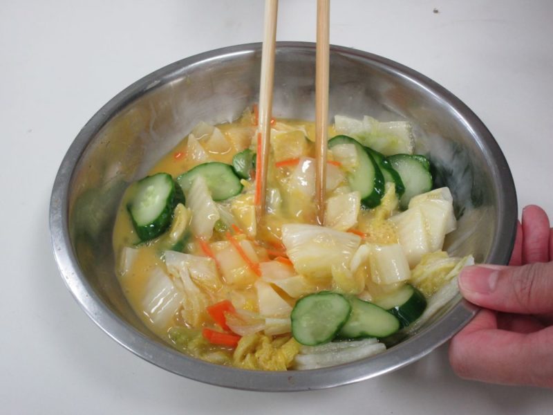 白菜漬け、きゅうりのぬか漬けは水でよく洗い水気を絞ります。