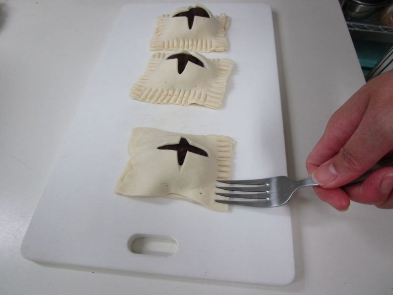 ②に切れ目を入れたパイシートをのせ、縁をフォークで押さえます。