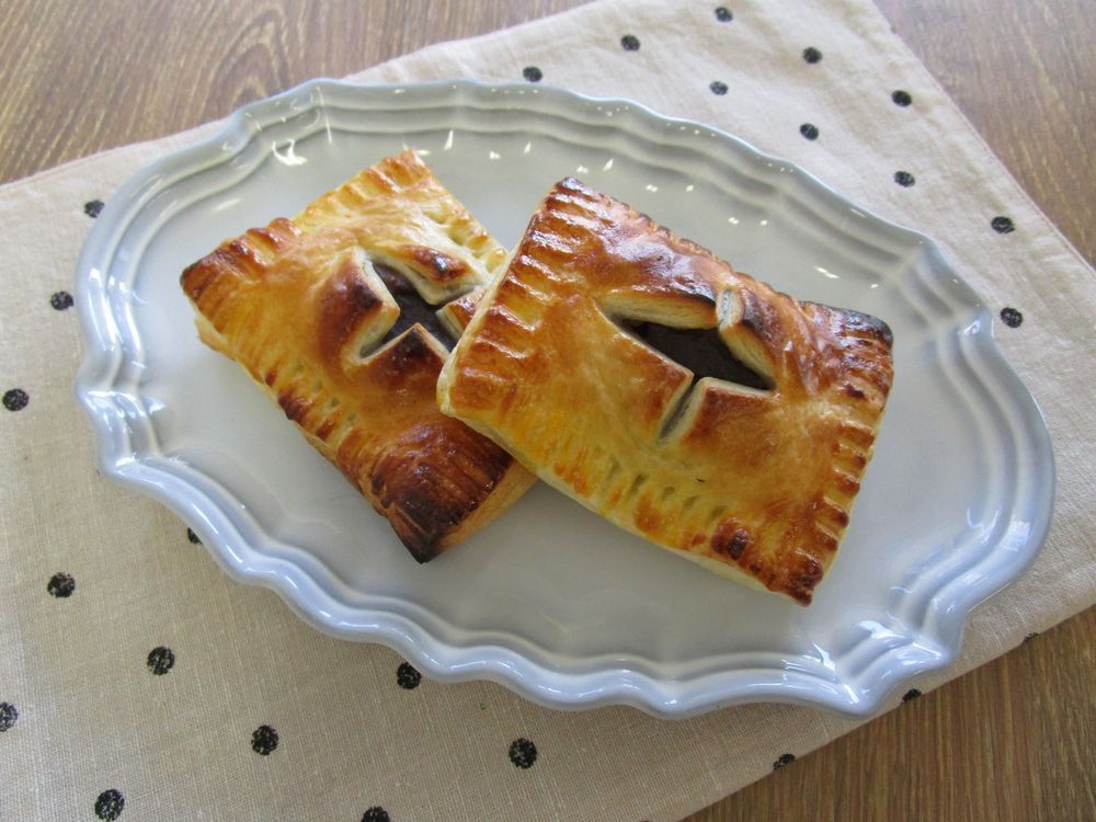 ①の切れ目が入っていないパイシートにクリームチーズとあんこをのせます。