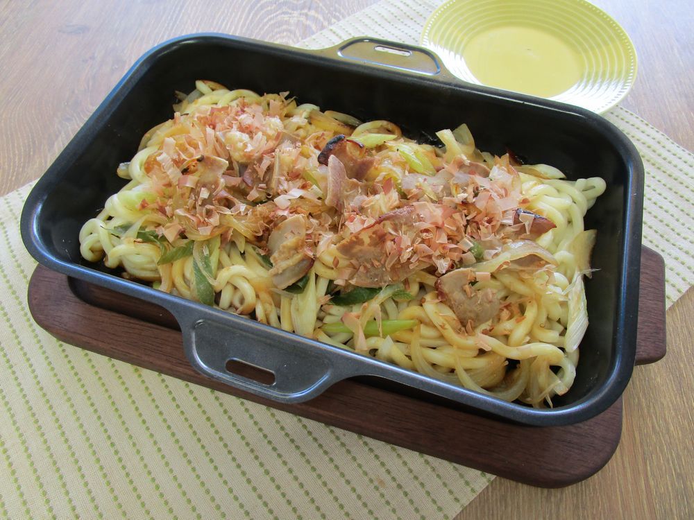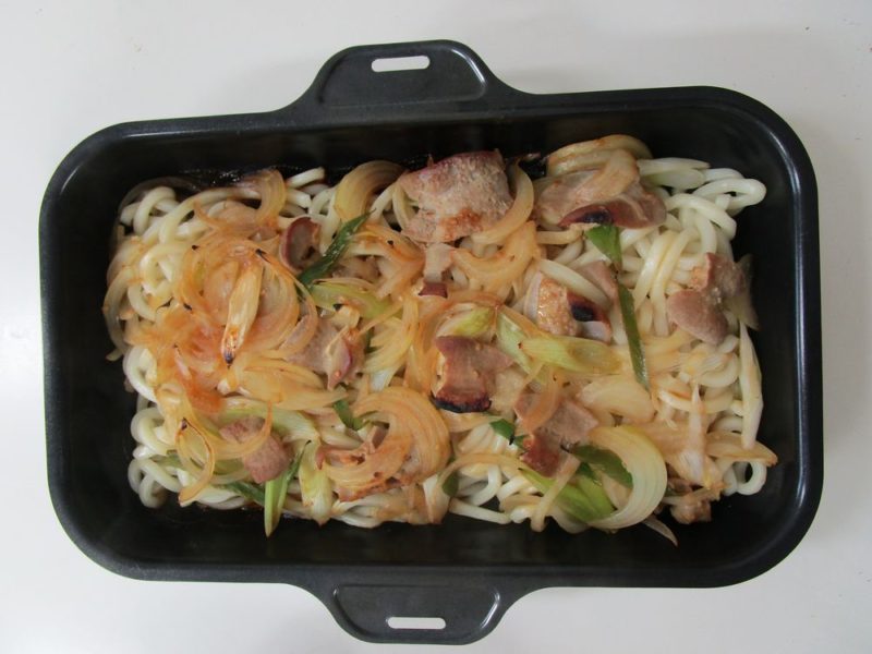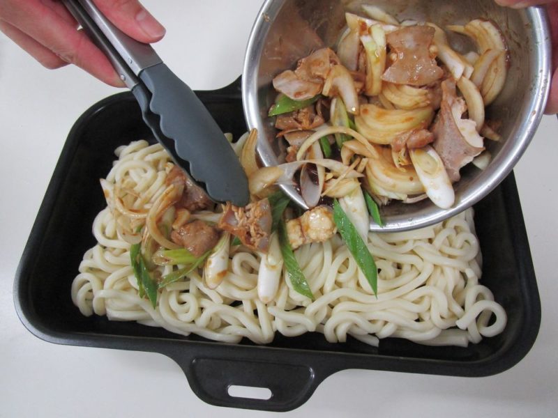ラ・クックグランにうどんを敷き詰め、①をかけて加熱します。