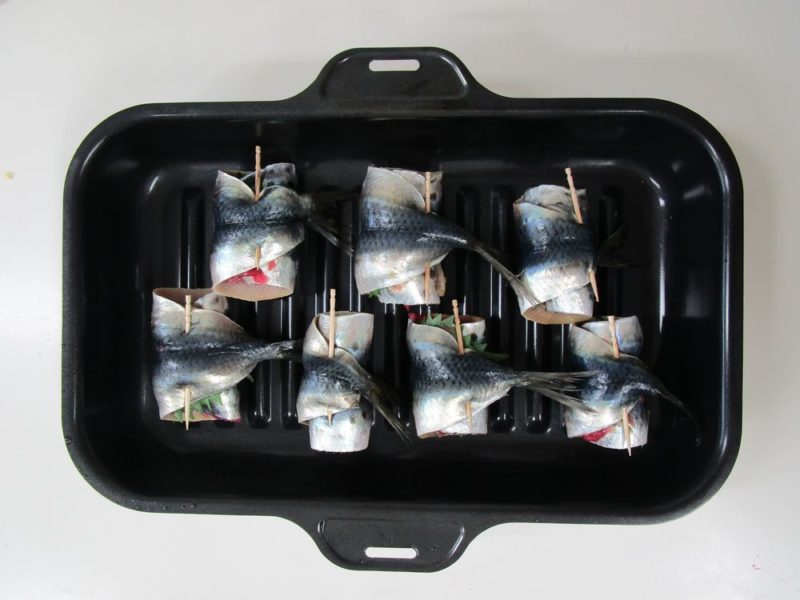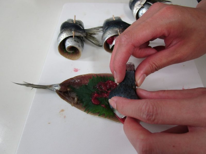 いわしに大葉を敷いて梅肉を塗り、尻尾にかけてくるくると巻き、巻き終わりを爪楊枝でとめます。