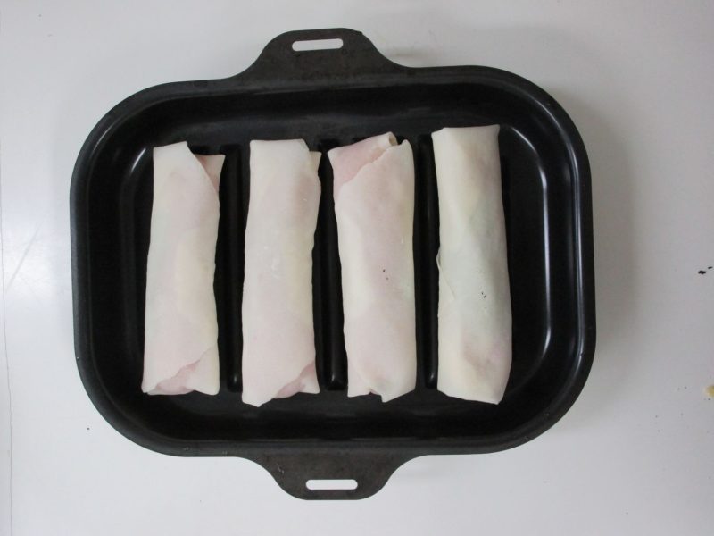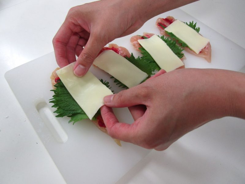 ①のささみに梅肉を塗り、大葉をのせ、スライスチーズを挟みます。