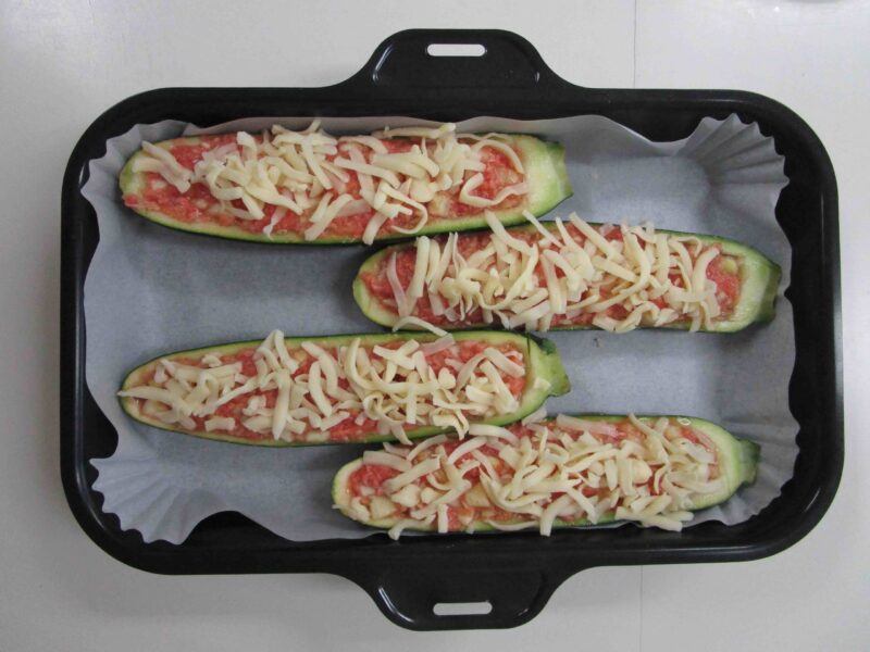 ズッキーニは縦半分に切り、中身をスプーンなどでくり抜き、くり抜いた中身はみじん切りに切ります。