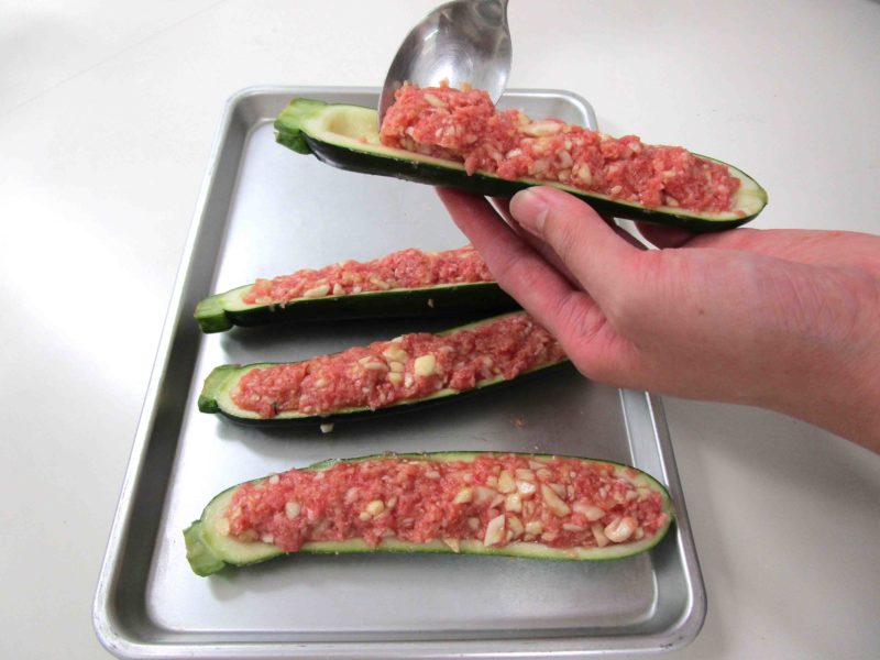 ズッキーニは縦半分に切り、中身をスプーンなどでくり抜き、くり抜いた中身はみじん切りに切ります。