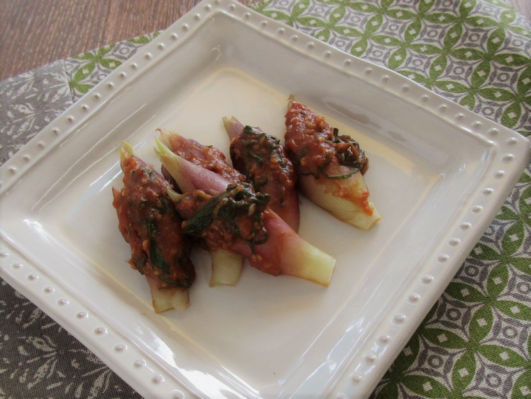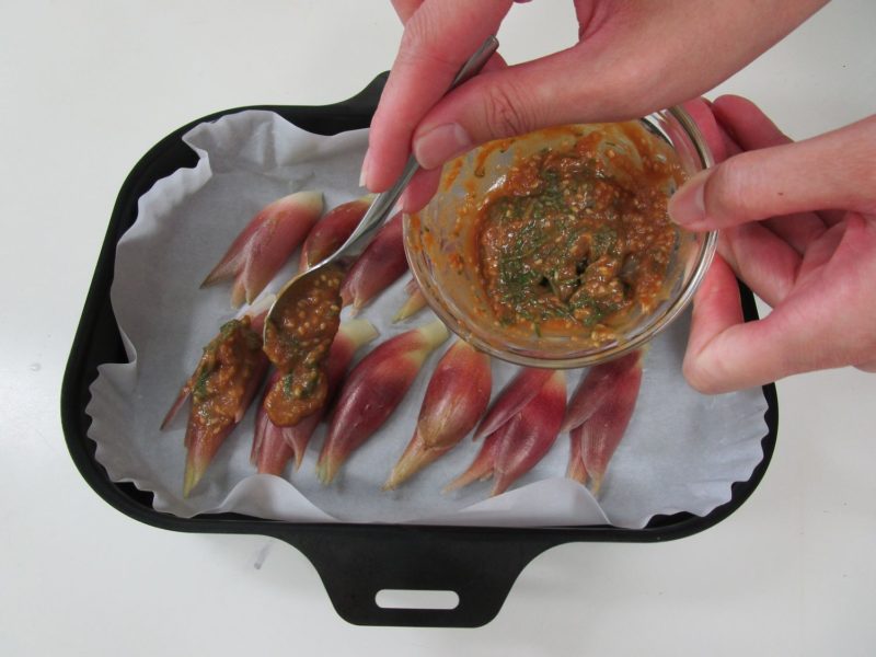 Aを合わせ、大葉と白ごまを加えて混ぜ、①のみょうがにかけて焼きます。