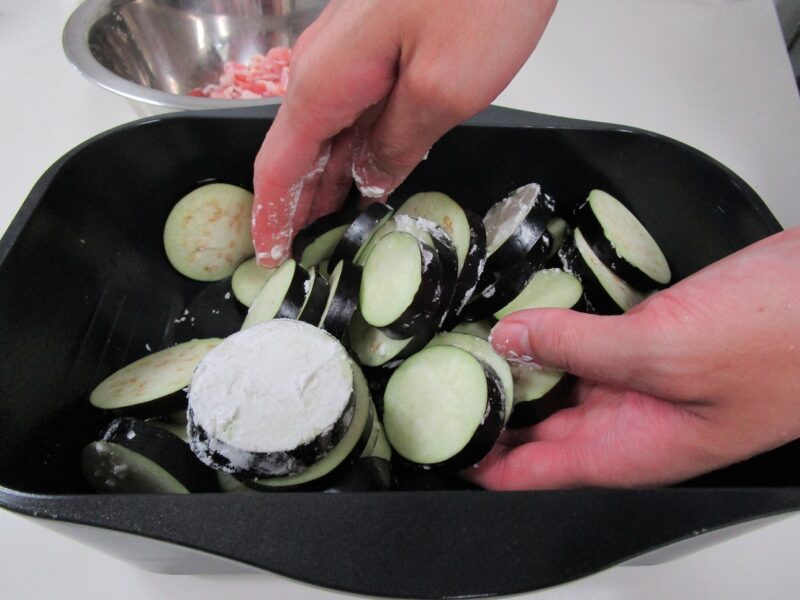 ラ・クックグランポットに①のなすを入れ、残りの片栗粉をまぶします。