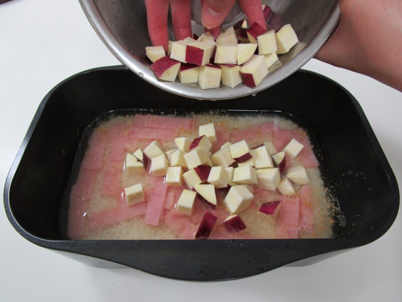 ベーコンは1㎝幅に切ります。さつまいもは1㎝角に切り、水に15分ほど浸したら、水気をよく切っておきます。