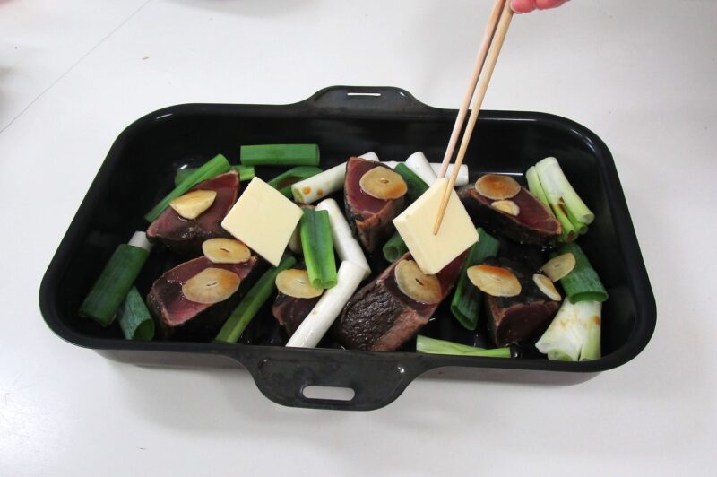 かつおは2㎝幅に切り、全体に塩を振っておき、長ネギは4㎝の長さに切ります。
