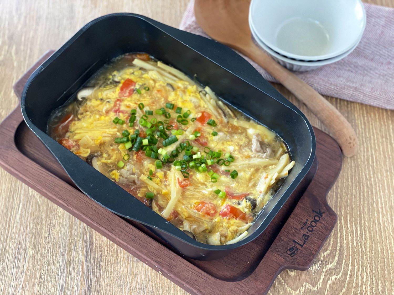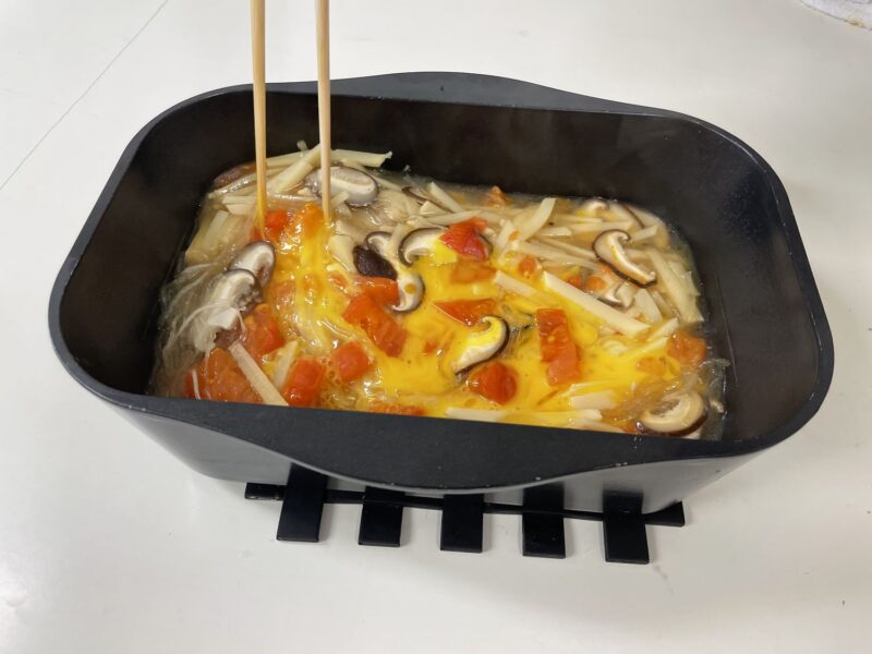 加熱後、溶き卵を加えて軽く混ぜ、蓋をして5分ほどおき、万能ネギを散らします。
