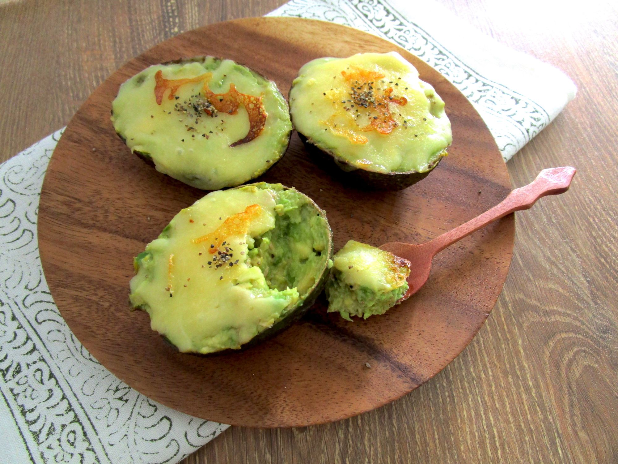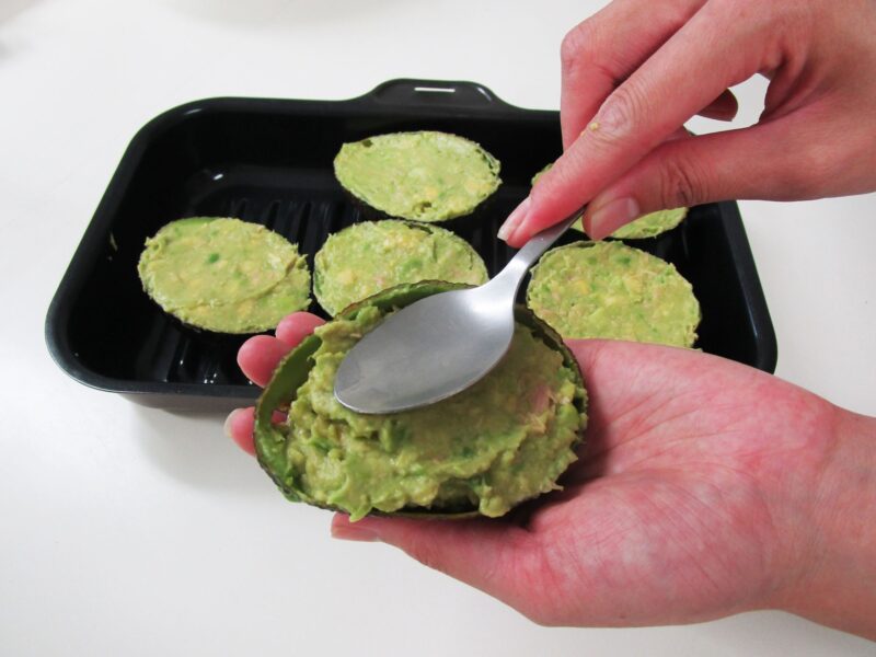 アボカドは半分に切り、種を除き、スプーンなどで実を取り出します。皮は取っておきます。