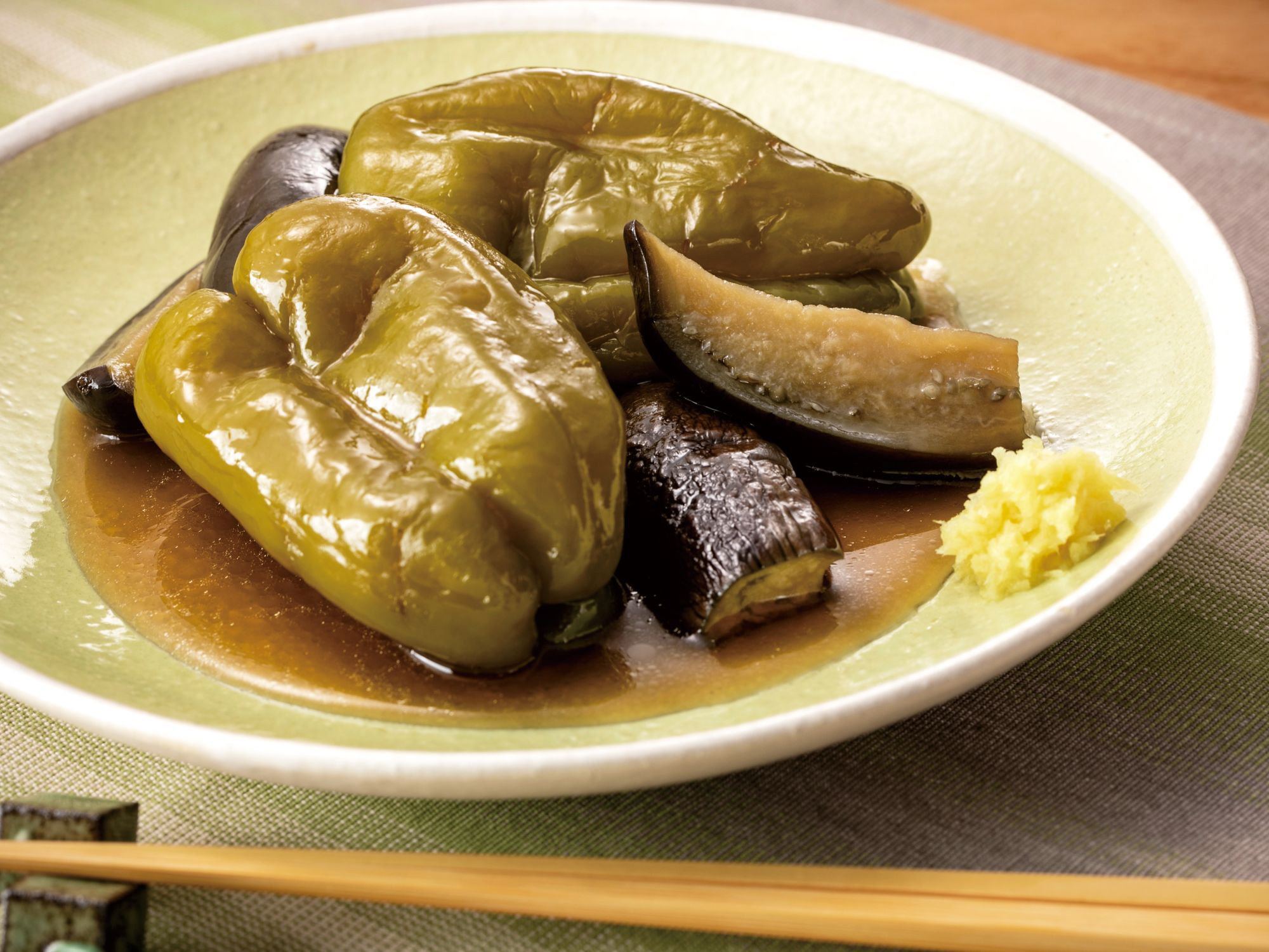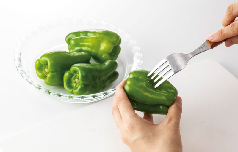 ピーマンは全体的にフォークで穴を開け、なすは8等分に切ります。