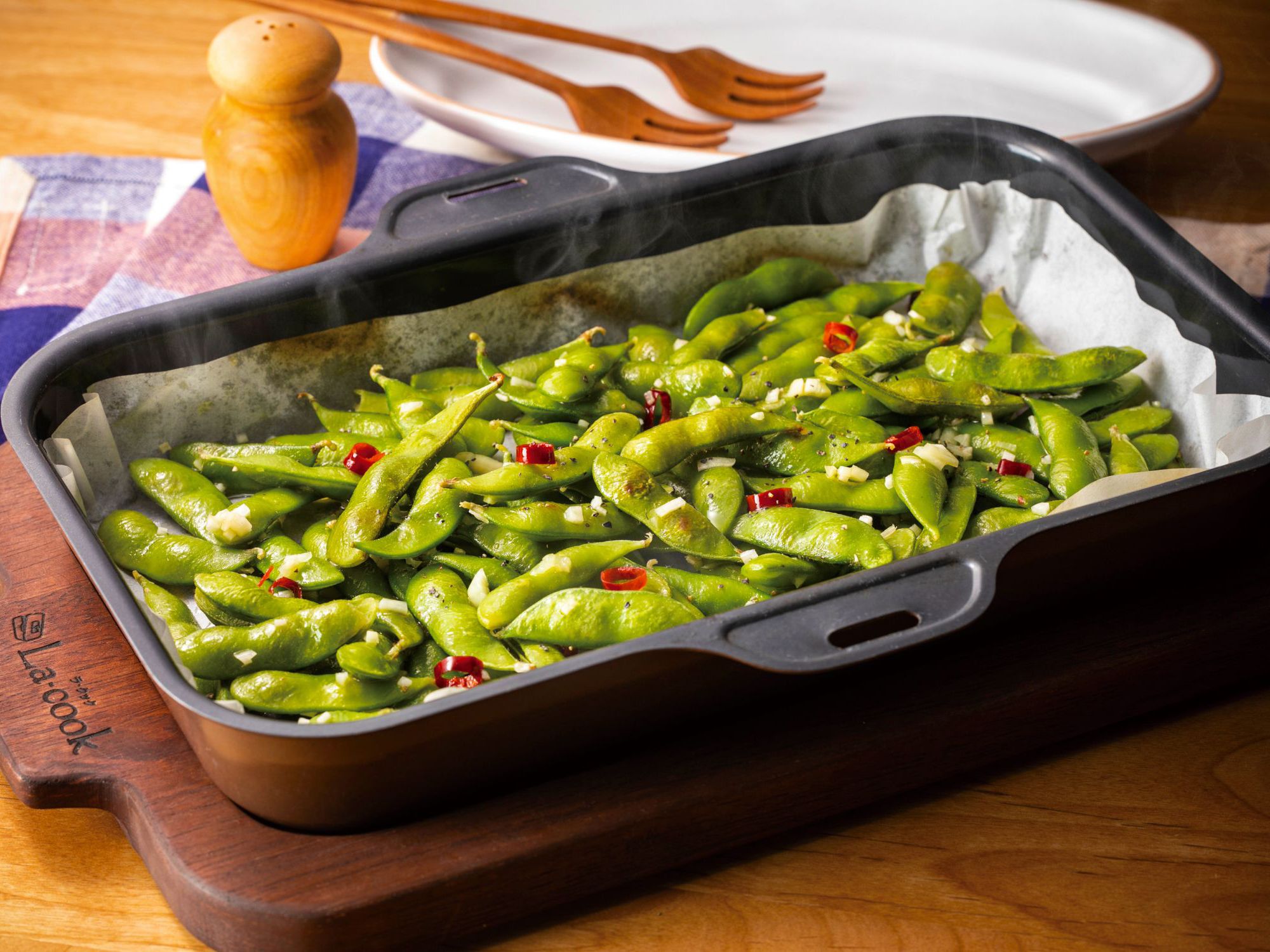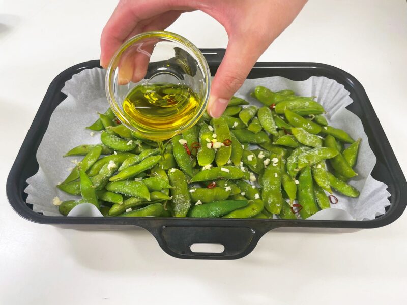 ラ・クックグランにクッキングシートを敷き、冷凍枝豆を入れます。