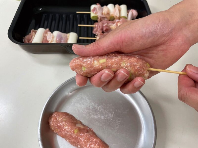 鶏ひき肉とAの調味料を混ぜ合わせ2等分に分け、串につけて形を整えます。