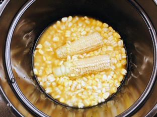 炊飯鍋にほぐしたとうもろこしと芯を加えて、炊飯鍋をコンロにセットし炊込みモードボタンを押します。